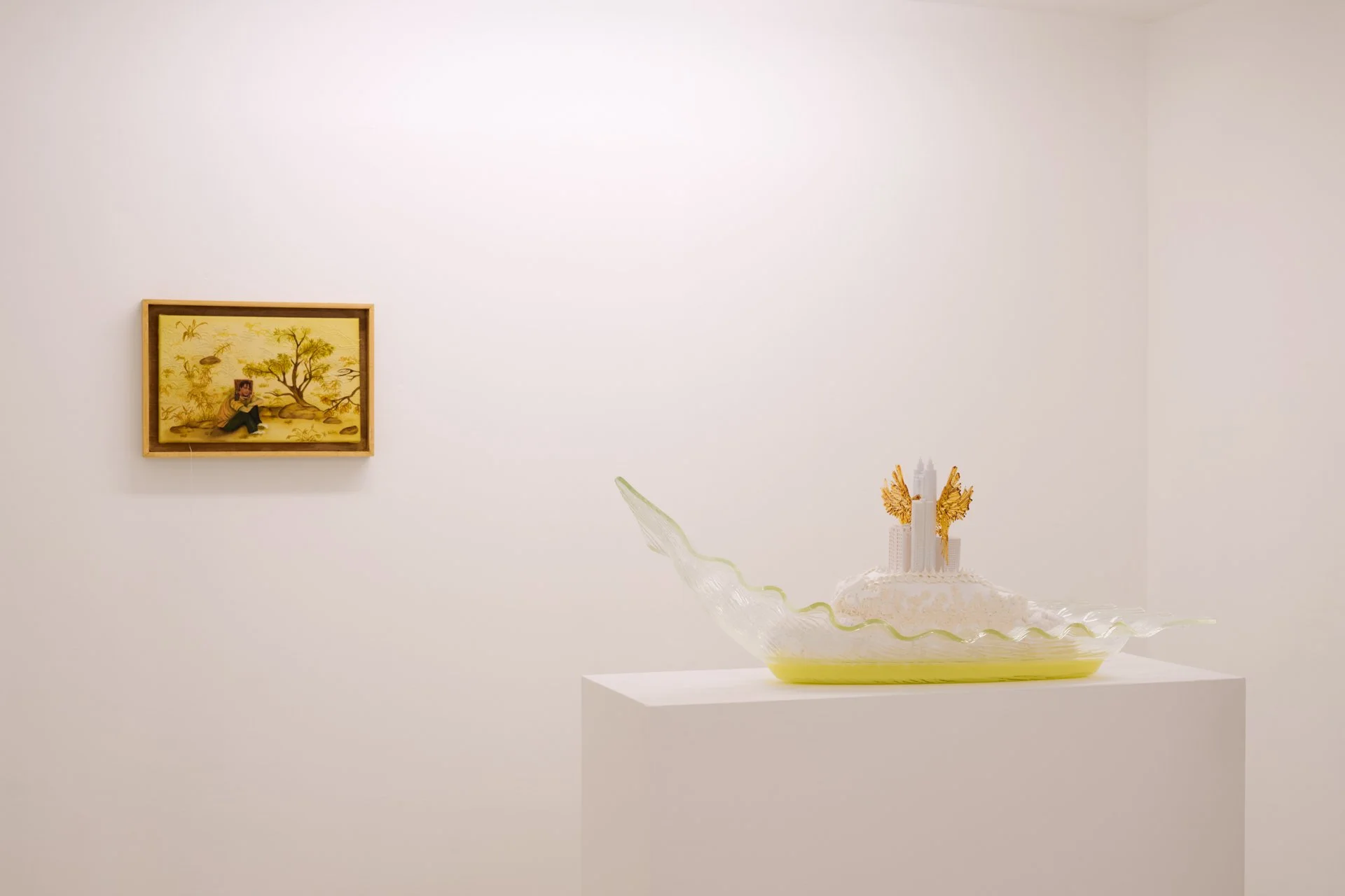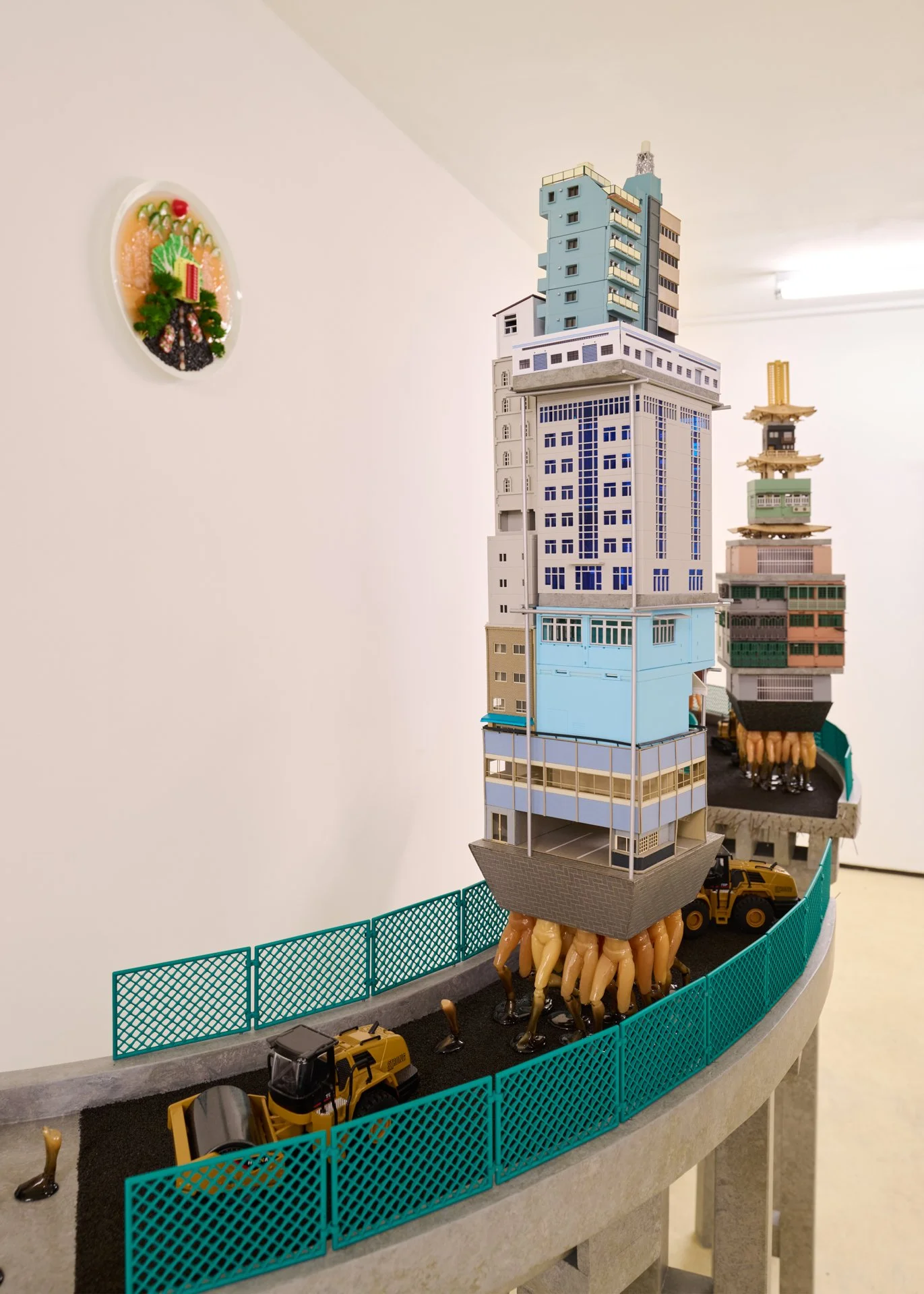 This is rendered corporeal in Meitao Qu’s two-part installation Round and Round We Go (2024). In one room, a building block castle that looks as if it’s been pulled straight from Disneyland slowly rotates on a silver butler’s tray, revealing the utilitarian architectures behind its pastel facade. In contrast to the miniature villas beneath which elongate into narrow apartment blocks, surrounding it like cardinal points, the castle itself is elevated on a dessert tray, and covered by a cloche dome. There’s something distant, utopian, about the castle, as if it exists through the haze of memory. In another room, Qu extends this creation of miniature worlds with parade floats of brutalist skyscrapers and construction machinery; there’s a decadence to these sculptures, even as they’re rendered inseparable from the labour of their creation - the model legs of workers whose upper bodies have been subsumed by the structures, the space between labour and its product collapsing together.