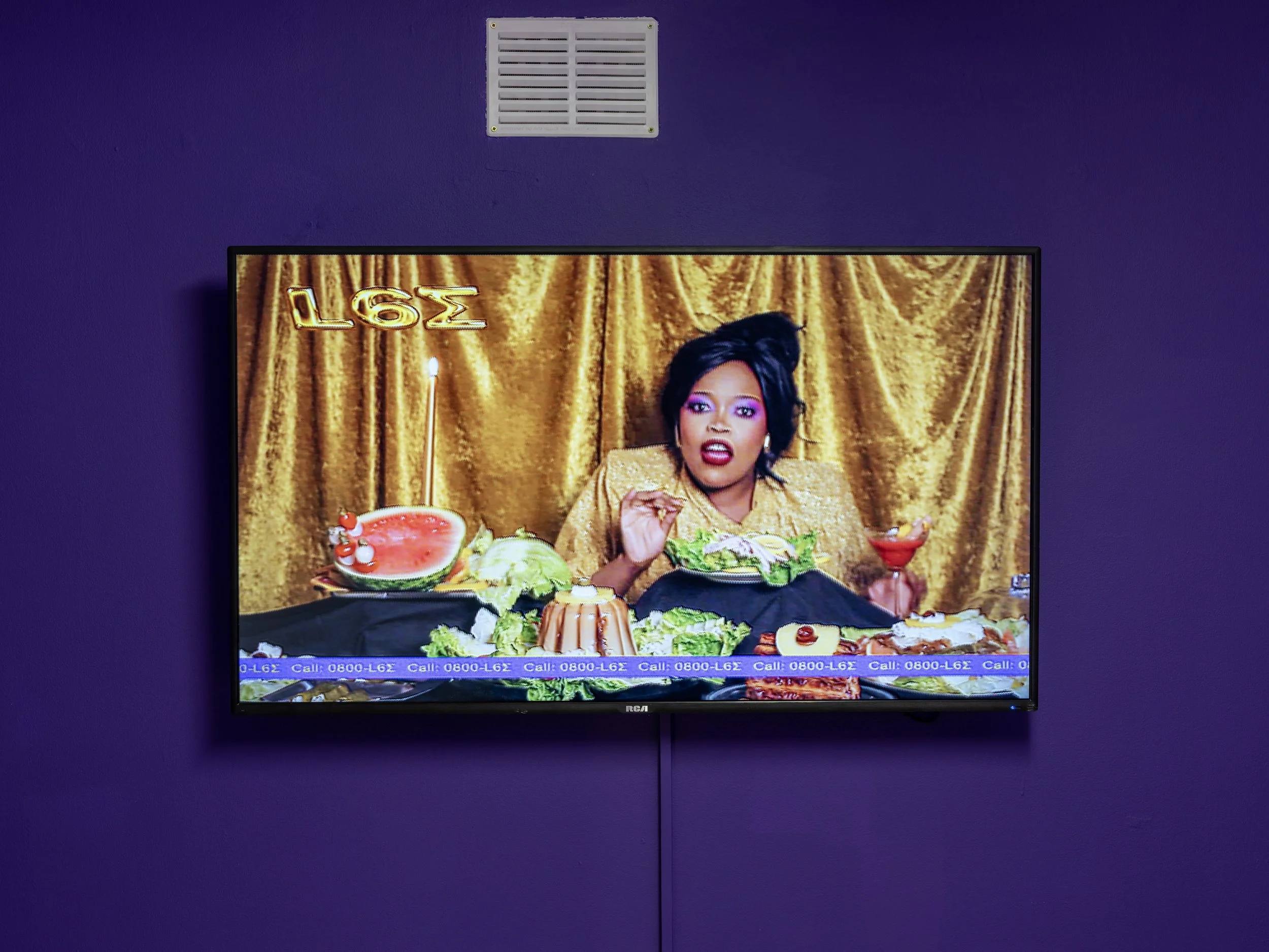 The work looks at opulence as a display of oligarchic overindulgence from a privileged few, distorting and multiplying the shapes of extractive industrial machinery, and the interior aesthetics of dictators’ homes and private jets. However, it also celebrates opulence as a means of Black resistance and Black joy. Lean Six Sigma flickers with formative memories of the artist’s Cameroonian immigrant aunties and uncles’ glamorously decorated homes, and the ostentatious personal styles of Black female rappers, chiefly Lil’ Kim.
