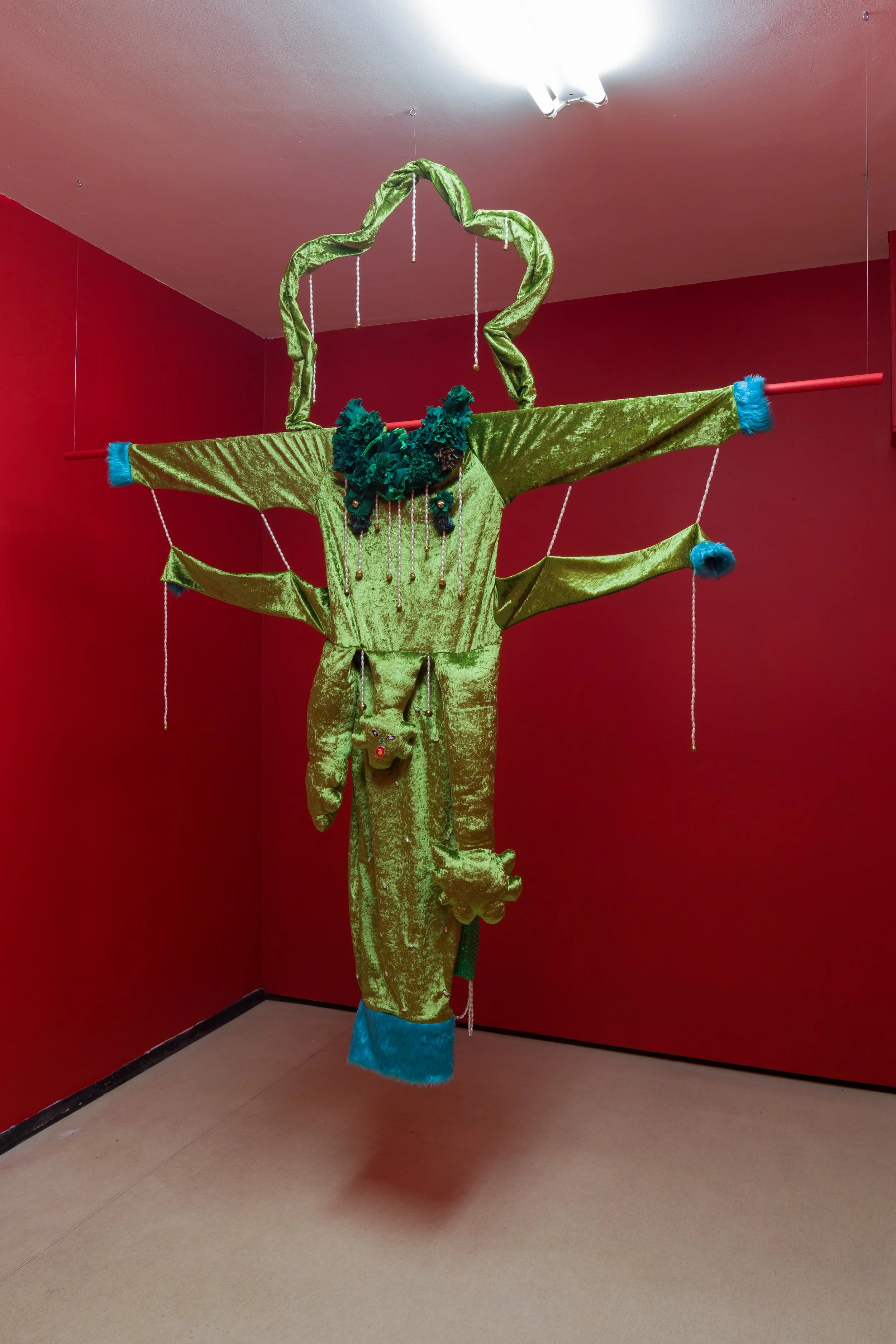 That genealogy also hangs with a costume, stilled. We’ve seen ºvegetableº before, too, in Song’s lenticular print; but is it quite the same? We might go back and check, but that image was elusive anyway, resisting interrogation. Just as bodies slip from that image, so one has slipped from this costume, leaving us to question who it was for, and who might wear it again. Arms outstretched, it blocks our way; but there is no way, just a dead end. Perhaps the costume itself is the means of escape; perhaps the outstretched arms beckon rather than block, inviting us to look through another window and gaze upon an unreachable enclave.